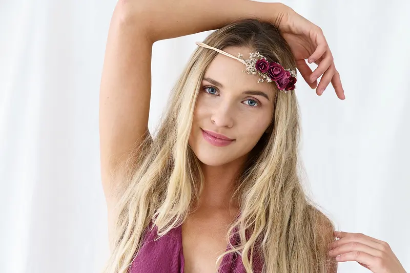 Une jolie couronne de fleurs de couleur bordeaux. La taille est réglable grâce au ruban intégré.