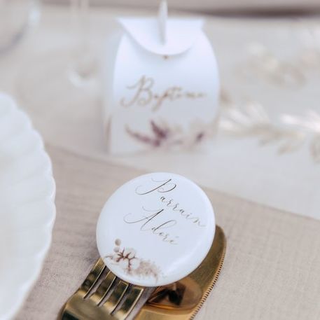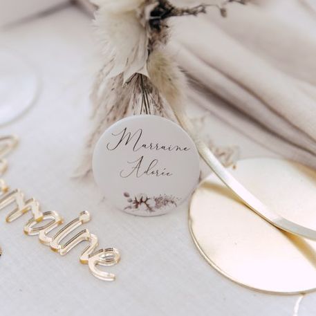 Lot de deux badges « Parrain Adoré » et « Marraine Adorée » avec inscription en Or métallisé et avec motif pampas et fleur de coton. Le cadeau original pour le parrain et la marraine, lors d’un baptême, une communion.