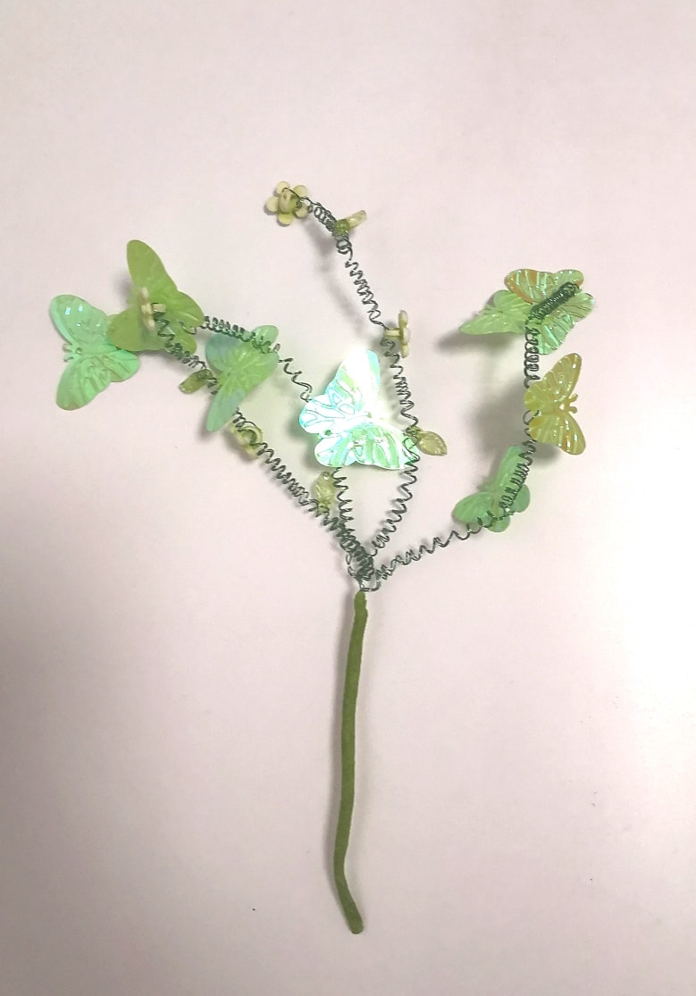 Magnifique bouquet sur tige de papillons et petites fleurs. Le bouquet mesure environ 12 cm de hauteur (sans la tige qui est à insérer au centre). Le « bouquet » est composé de 4 tiges ( 2 tiges : avec 4 papillons sur chacune des tiges et 2 autres tiges : avec deux fleurs et deux feuilles sur chacune de ces 2 tiges)