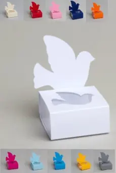 Lot de 6 boites blanches avec une colombe ! Assortissez vos boites à dragées communion à votre décoration de table communion.