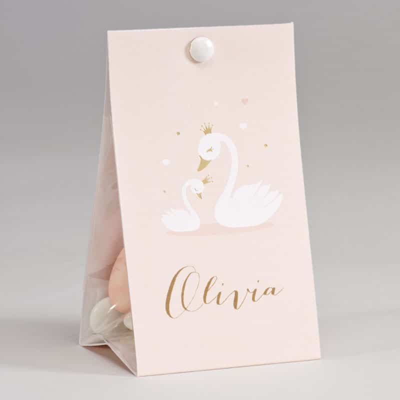 Boite à dragées Cygnes. Remplissez cette boîte à dragées avec nos délicieuses dragées puis offrez-les sans modération ! Personnalisez les avec prénom(s) et date, vos invités seront charmés.