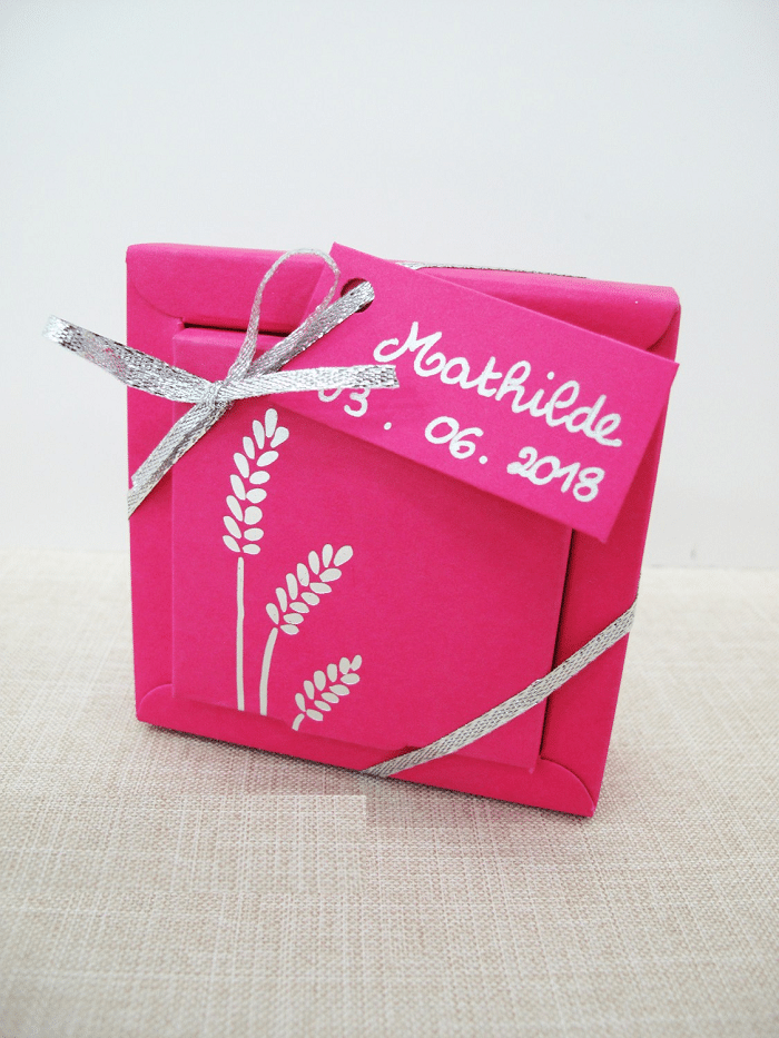 Jolie boite carrée cartonnée fuchsia avec 3 épis de blé argentés qui s’ouvre par le haut, livrée déjà montée. Idéal pour offrir à vos invités lors de la communion de votre enfant. Ruban, dragées et étiquette non compris dans le prix.
