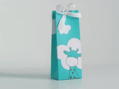 Jolie boite à dragées motif girafe, que vous offrirez afin de célébrer le baptême de votre enfant.