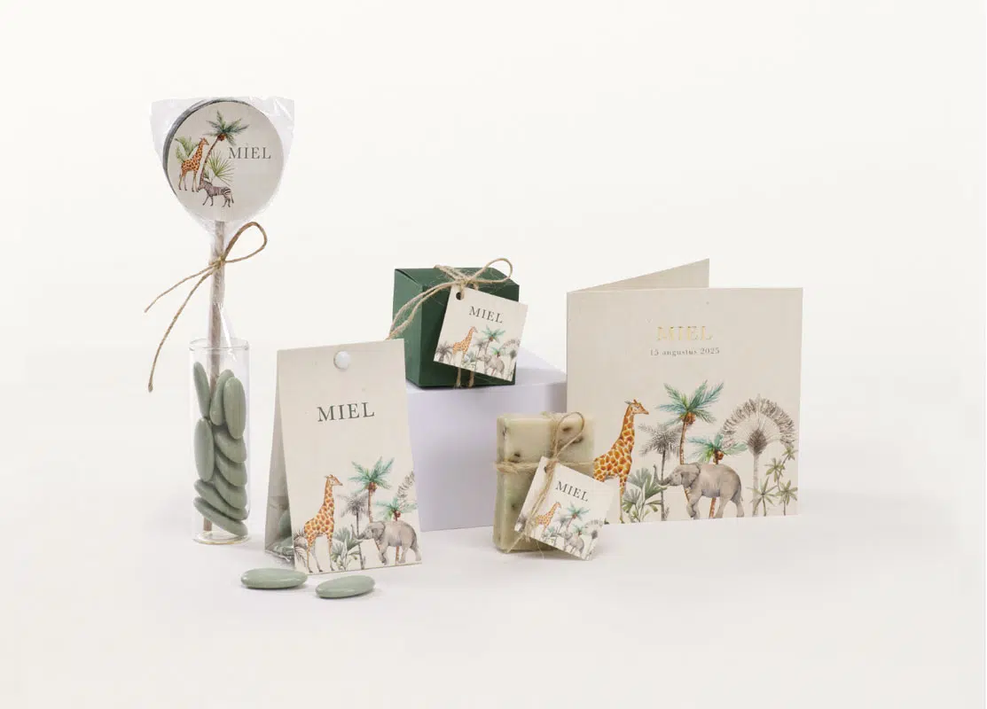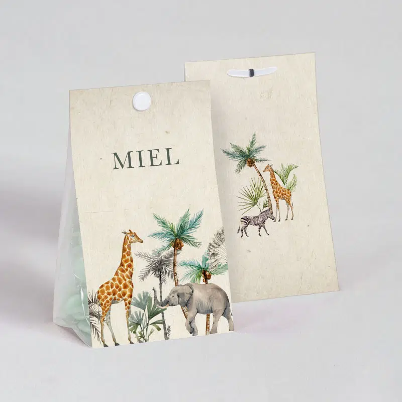 Boite à dragées Jungle. Remplissez cette boîte à dragées avec nos délicieuses dragées puis offrez-les sans modération ! Personnalisez les avec prénom(s) et date, vos invités seront charmés.