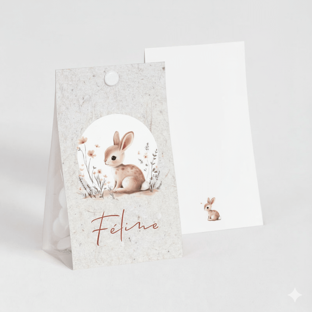 Pratique et élégant, l’étui se compose de deux faces imprimées reliées par un fond qui maintient parfaitement le sachet transparent (fourni). La perforation en haut permet une fermeture simple et esthétique, soit avec une attache (en option), soit avec un joli ruban assorti à votre thème.