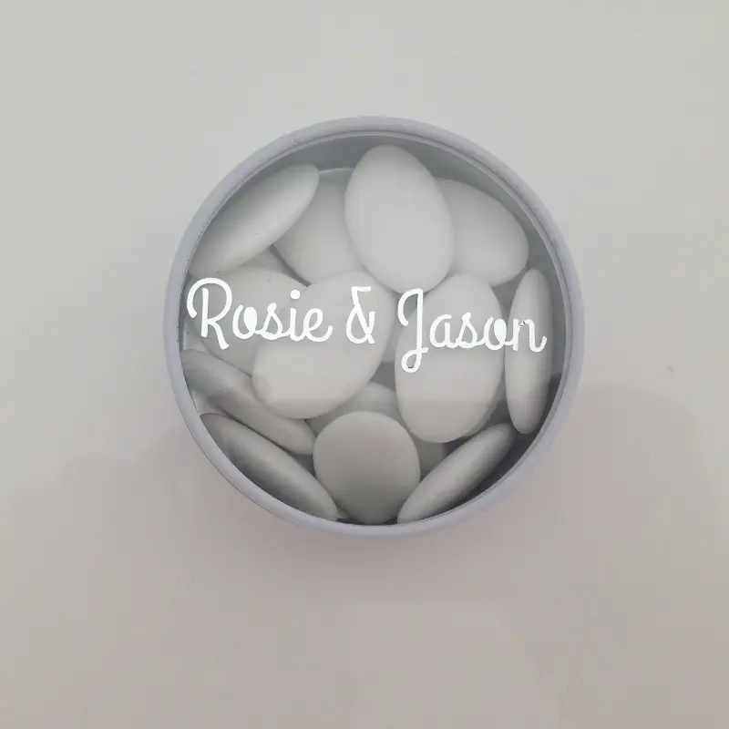 Boite à dragées métal ronde – blanc. Cette jolie boite à dragées ronde en métal de couleur blanche séduira vos convives. Elle mesure 6 cm de diamètre, et son couvercle translucide laissera apparaître nos délicieuse dragées. Vous pouvez agrémenter cette boite avec nos Stickers prénom pour un effet sobre et élégant. Cette jolie boite à dragées métal ronde est un cadeau utile en plus d’être gourmand, vos invités pourront réutiliser cette boite à dragées.