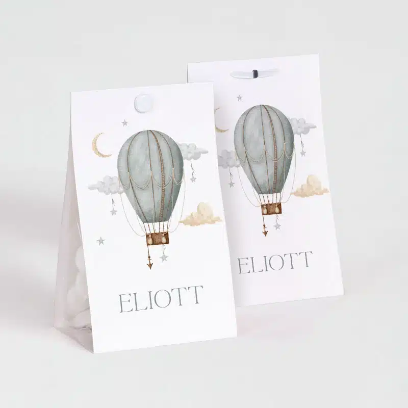 Boite à dragées montgolfière. Remplissez cette boîte à dragées avec nos délicieuses dragées puis offrez-les sans modération ! Personnalisez les avec prénom(s) et date, vos invités seront charmés.
