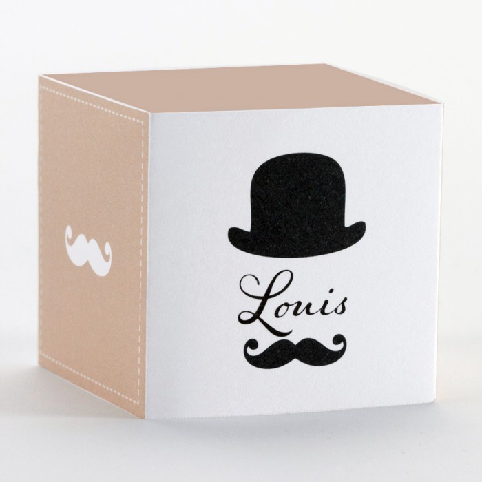 Offrez de manière chic et tendance vos dragées grâce à ce joli cube orné d’un chapeau melon et d’une moustache. Simple et original, ce contenant à dragées moustache est livré avec :