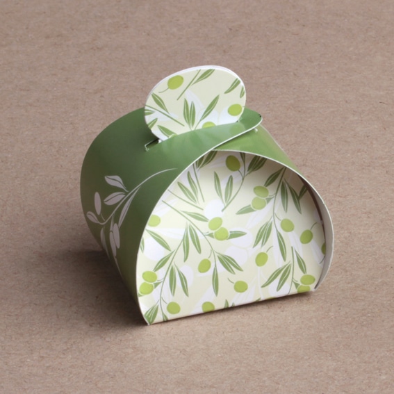 Tout petit contenant à dragées thème olivier avec anse, finition brillant.