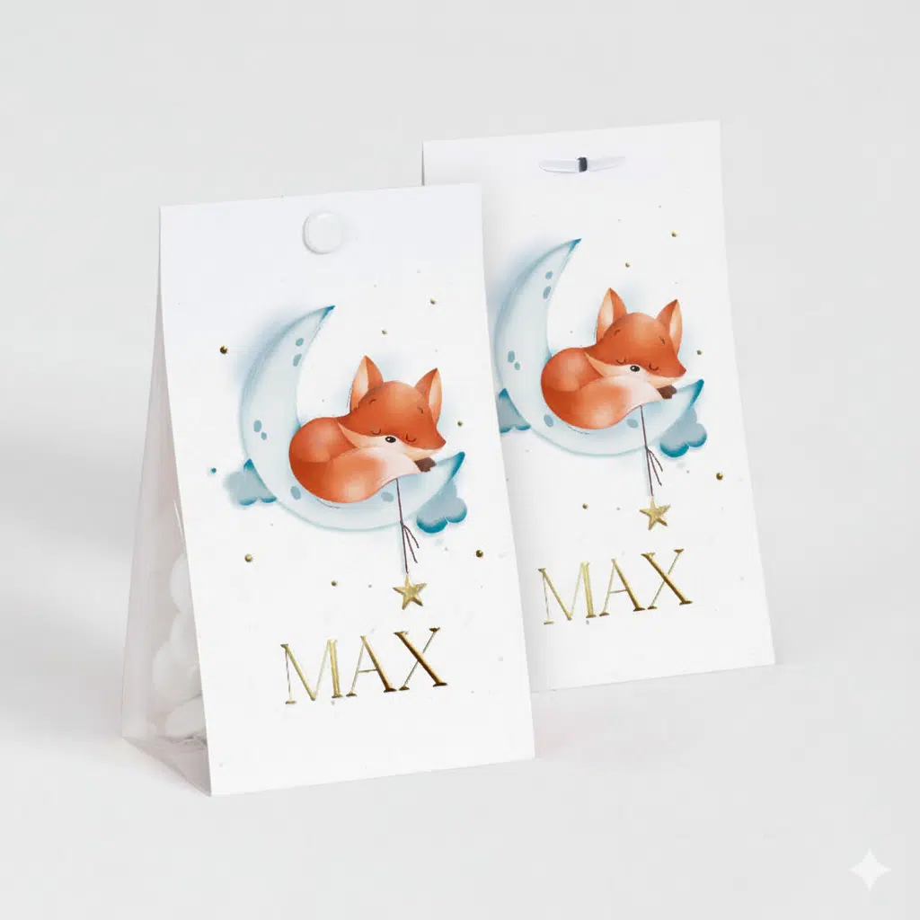 Pratique et élégant, l’étui se compose de deux faces imprimées reliées par un fond qui maintient parfaitement le sachet transparent (fourni). La perforation en haut permet une fermeture simple et esthétique, soit avec une attache (en option), soit avec un joli ruban assorti à votre thème.