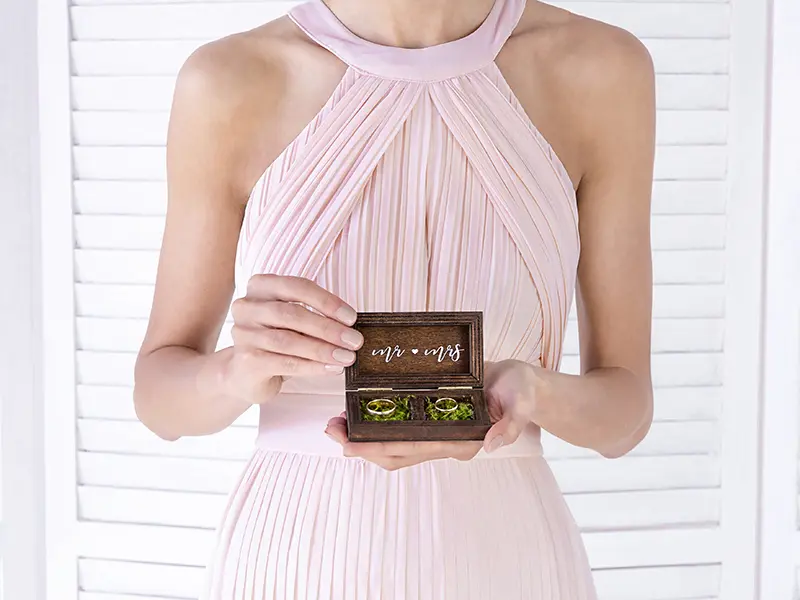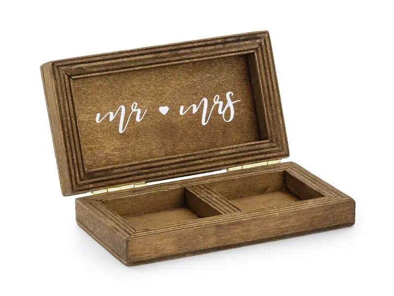 Boite alliance champêtre, avec impression en blanc, pour votre cérémonie de mariage. A l’intérieur vous y trouverez 2 compartiments pour y disposer vos alliances.