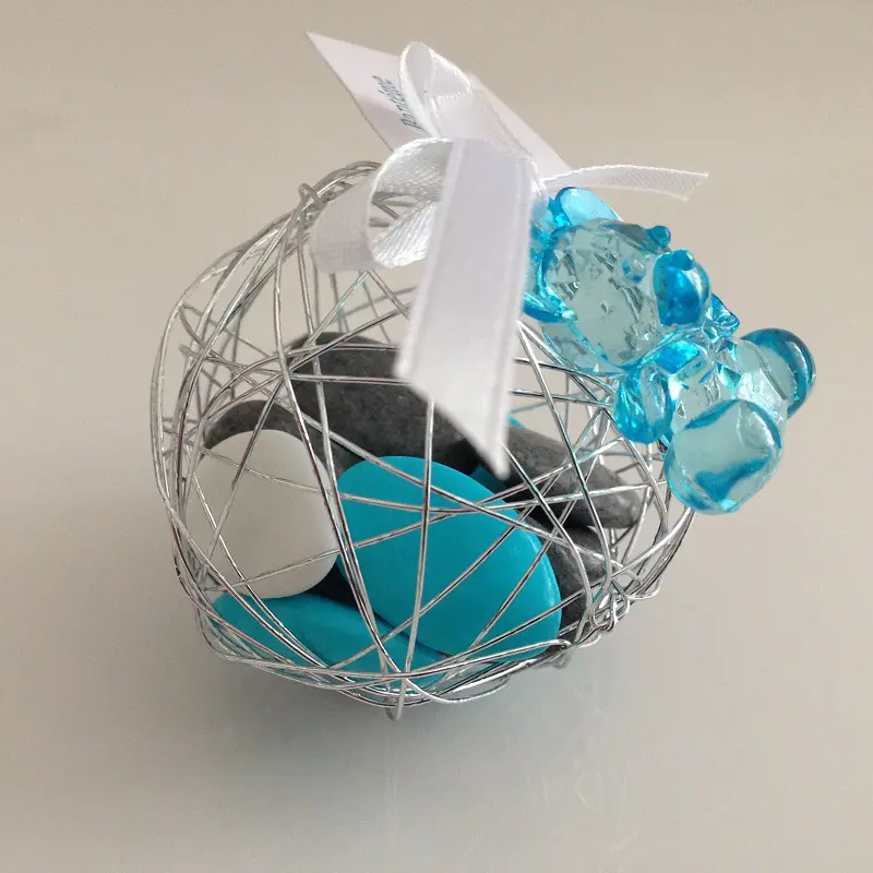 La Boule métallique à dragées n’est pas compris dans le prix mais elle fera un superbe contenant à assortir à votre pendentif ourson turquoise. Cela fera un contenant à dragées de baptême original ! La boule en métal de diamètre 5-6 cm (selon arrivage) et le pendentif ourson turquoise seront s’adapter facilement à votre décoration de baptême. Vous devrez à l’aide d’un ruban accrocher le petit ourson à la boule métallique autour d’un fil métallisé. Si vous optez pour l’associer çà une boule métallique suivez les conseils ci dessous: