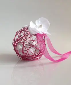 La boule est déjà formée, elle ne s’ouvre pas en 2. Il vous suffira d’écarter les mailles de fils métallisé pour y insérer vos dragées environ 25 à 30 gr soit 8 à 10 dragées. (attention pas de dragées petits cœurs, il passeraient à travers les mailles).