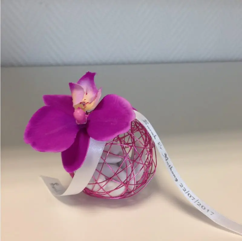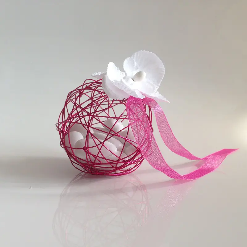 Très jolie boule à dragées métallique de couleur rose. Ce joli contenant à dragées rose pourra être accessoirisé par une étiquette (choisissez la forme en fonction de votre événement), une plume, un pendentif…