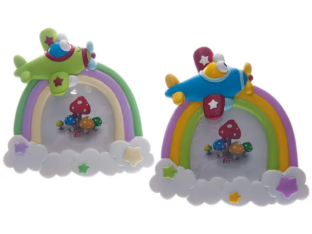 Cadre photo avion vert sur arc-en-ciel vert, rose et jaune.