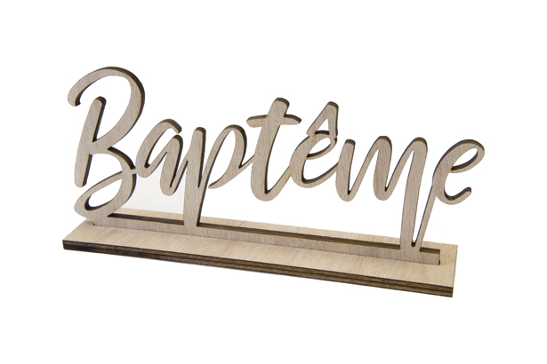 Centre de table « Baptême » en bois naturel, avec support permettant de le disposer aisément sur votre table lors d’un baptême.