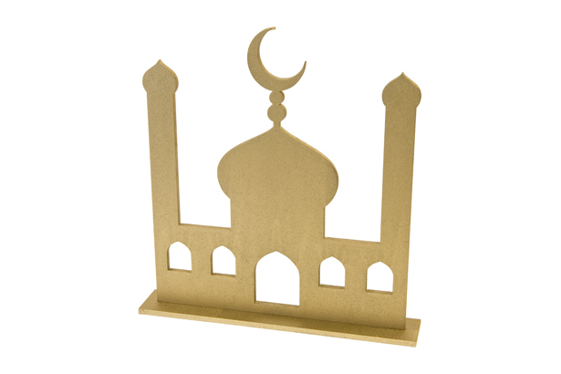 La déco silhouette de Mosquée est une pièce magnifique qui apportera une touche d’élégance à votre décoration d’intérieur. Elle est fabriquée en bois doré et représente une mosquée avec des minarets et un croissant de lune.