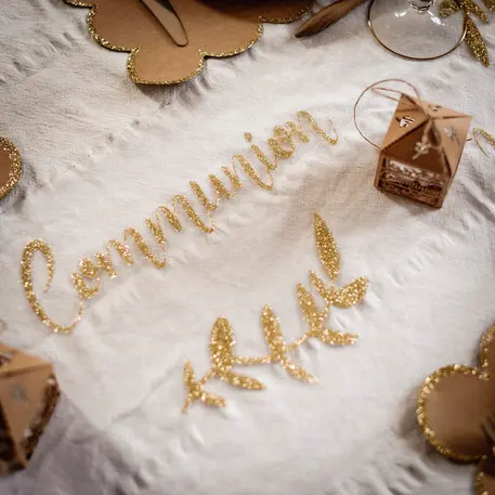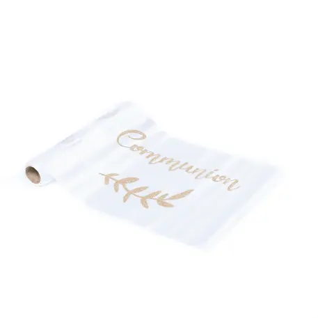 Très beau chemin de table en organza blanc avec impression « Communion » Or . Idéal pour une présentation de table élégante et raffinée !