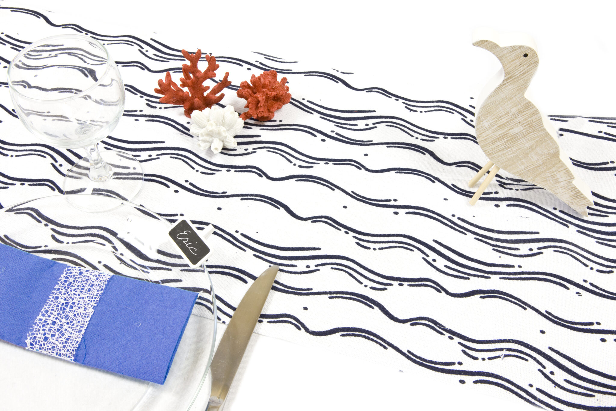 Chemin de table thème mer en toile, blanc avec imprimé vagues bleu marine. Ce chemin de table sera parfait pour dresser une jolie table pour une décoration réussie sur le thème de la mer.