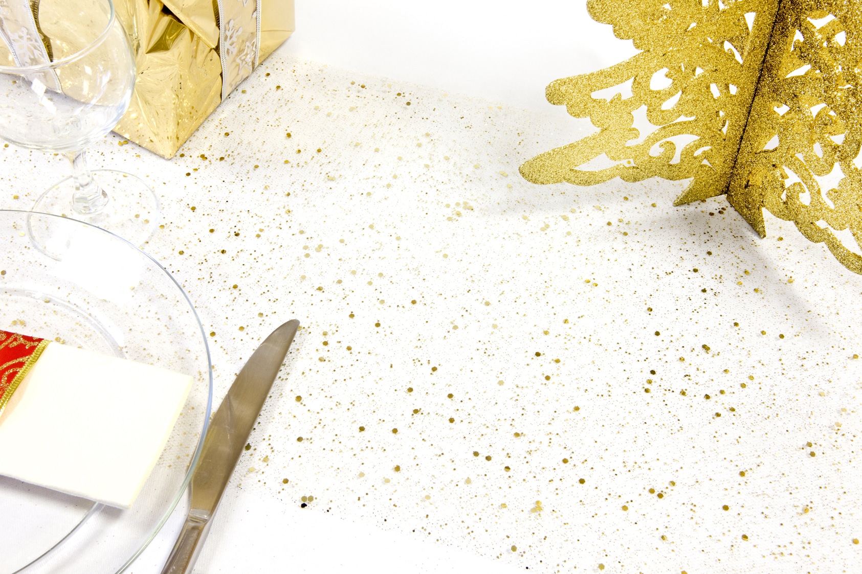 Dressez une ravissante table de fête avec ce chemin de table pailleté de couleur doré en tulle.