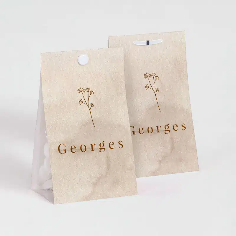 Pratique et élégant, l’étui se compose de deux faces imprimées reliées par un fond qui maintient parfaitement le sachet transparent (fourni). La perforation en haut permet une fermeture simple et esthétique, soit avec une attache (en option), soit avec un joli ruban assorti à votre thème.