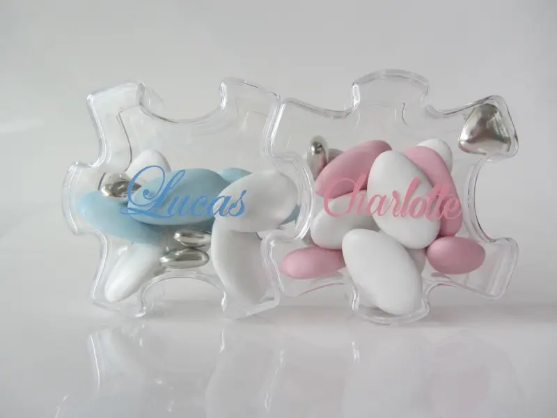Contenant à dragées puzzle : voila une boite à dragées originale qui amusera à coup sûr vos invités. Les boîtes  à dragées s’emboîtent parfaitement bien entre elles. Elles pourront donc parfaitement être utilisé pour des jumeaux ou des jumelles, pour ce cas il faudra prendre 2 boites par convives afin de les emboîter et de les présenter par 2 ou par 3 pour des triplés…