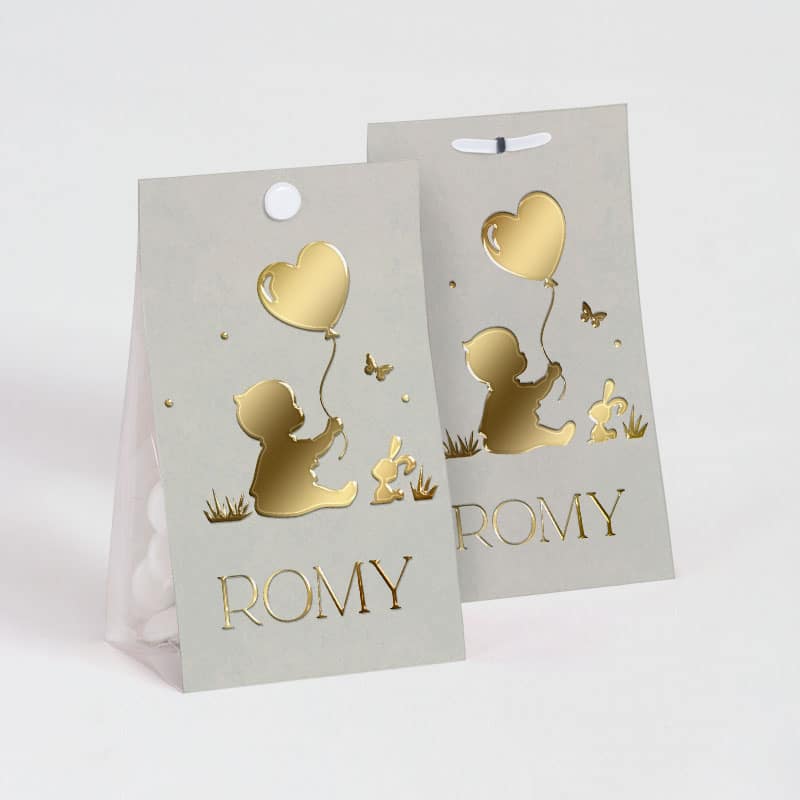 Pratique et élégant, l’étui se compose de deux faces imprimées reliées par un fond qui maintient parfaitement le sachet transparent (fourni). La perforation en haut permet une fermeture simple et esthétique, soit avec une attache (en option), soit avec un joli ruban assorti à votre thème.