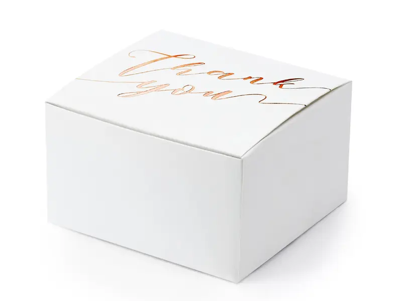 Jolie boite à dragées blanche à inscription « thank you » rose gold, à disposer sur votre table pour épater vos invités!