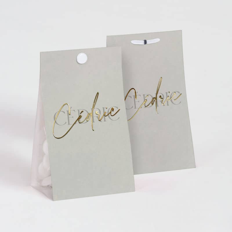 Pratique et élégant, l’étui se compose de deux faces imprimées reliées par un fond qui maintient parfaitement le sachet transparent (fourni). La perforation en haut permet une fermeture simple et esthétique, soit avec une attache (en option), soit avec un joli ruban assorti à votre thème.