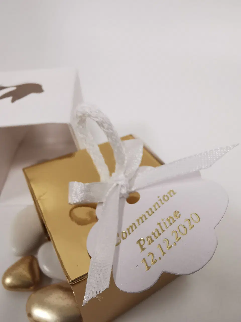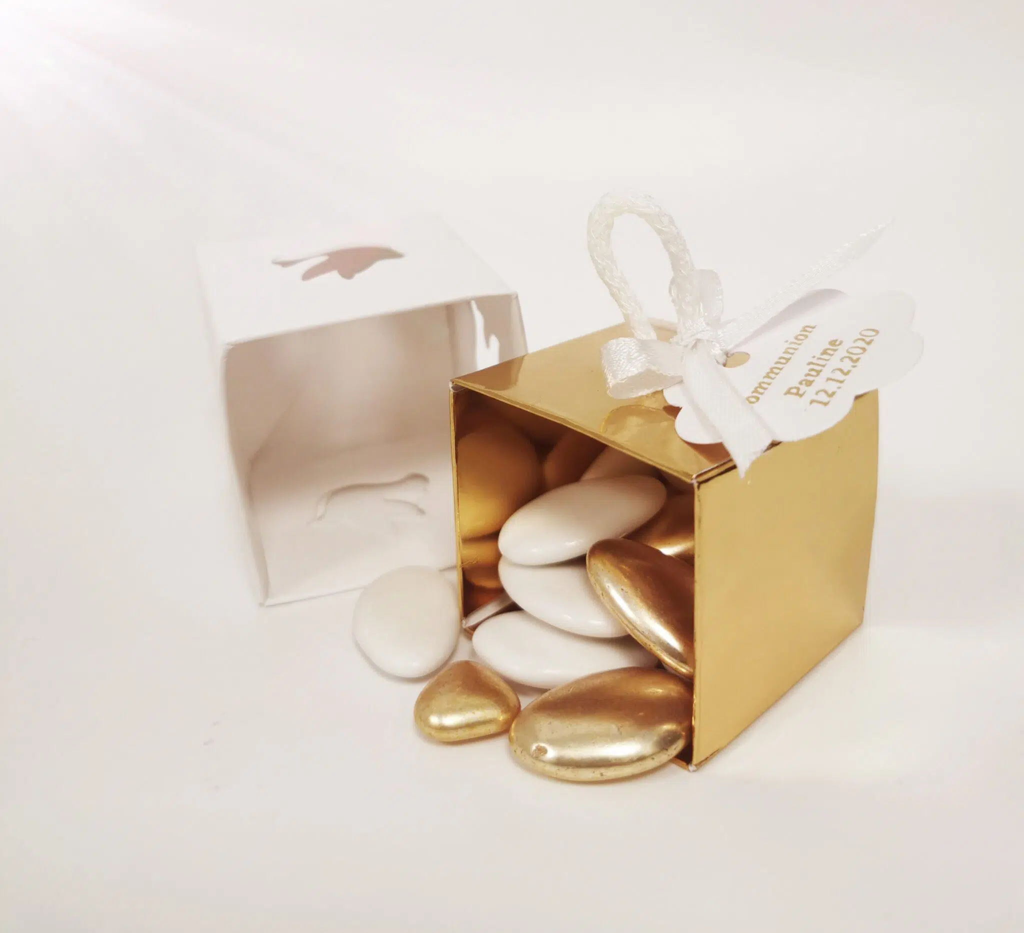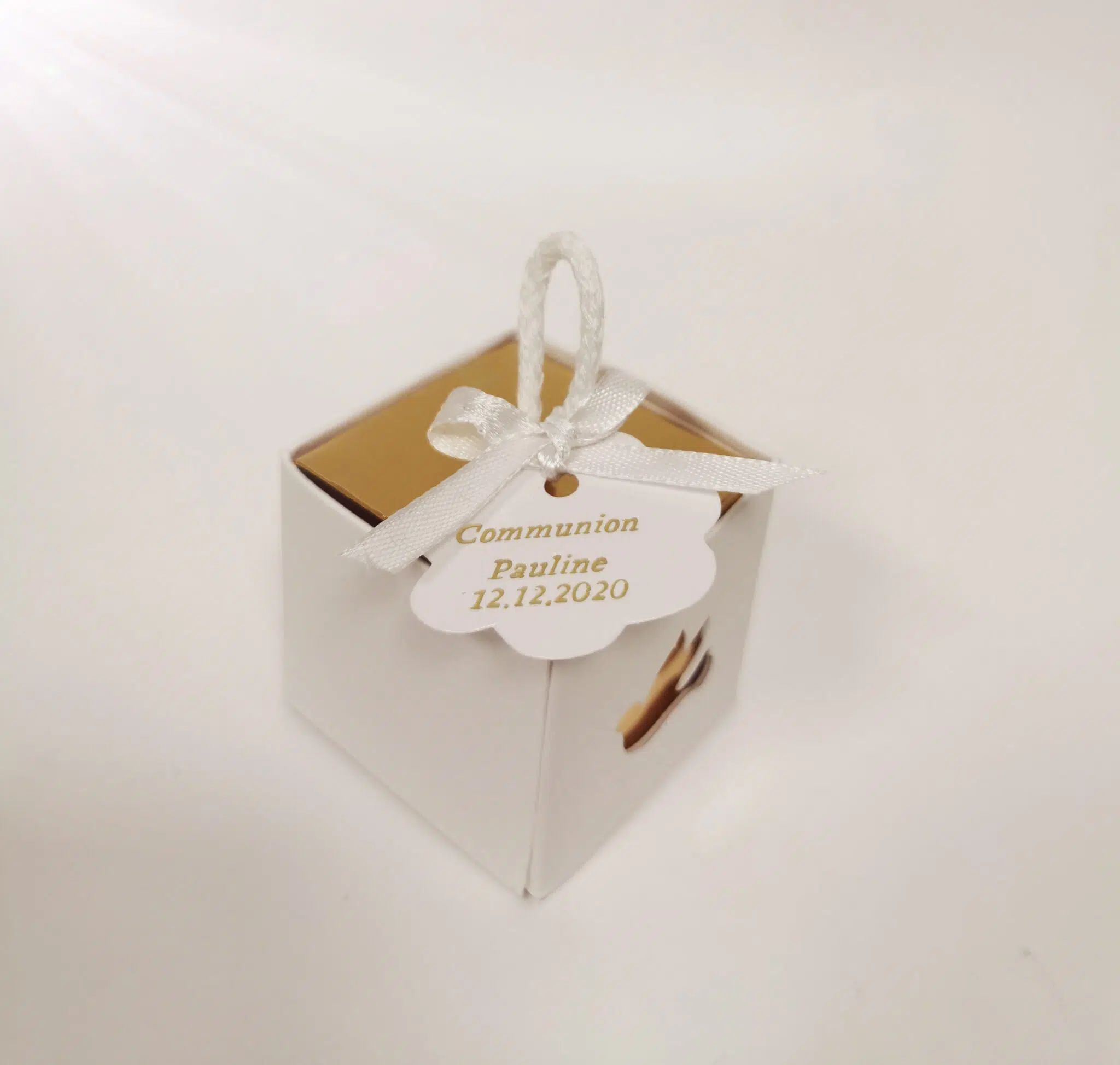 Contenant Dragées Communion – Cube ange Or – Cordelette – Lot de 10