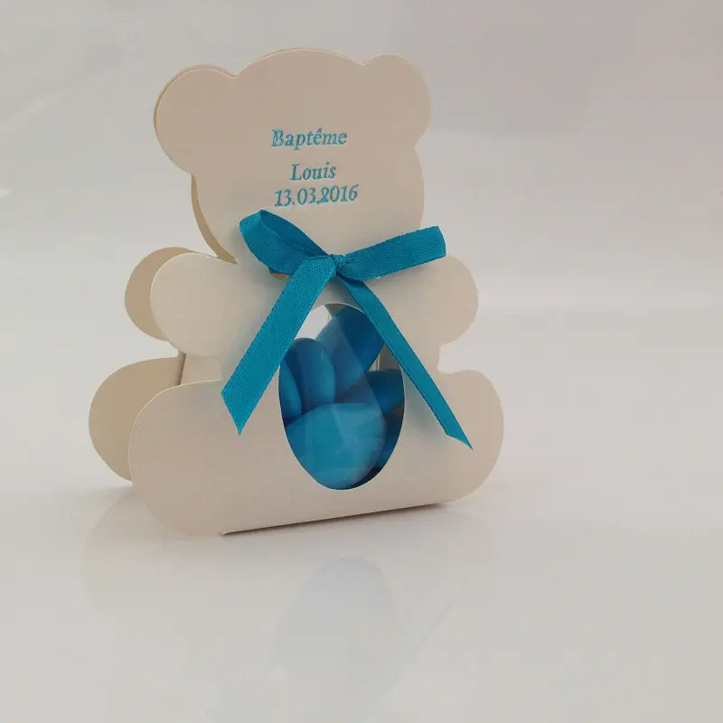Contenant à dragées en forme d’ourson. Originale et esthétique, cette boite à dragées ourson en carton contient un trapèze en plastique transparent qui laisse entrevoir les dragées. Ruban et dragées non fourni.