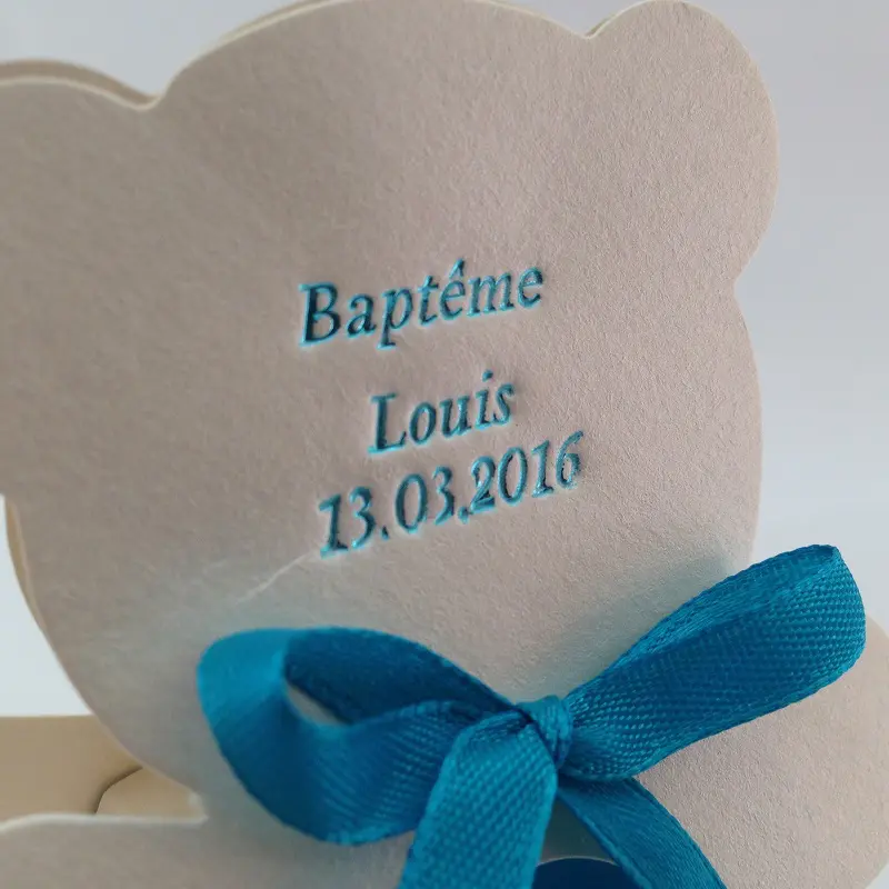 Personnalisez votre ourson à dragées avec le forfait impression dorure à chaud.