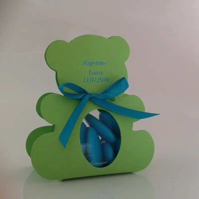 Originale et esthétique, cette boite à dragées ourson vert en carton contient un trapèze en plastique transparent qui laissera entrevoir vos dragées.