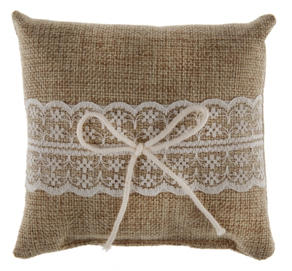Ajoutez une touche rustique et élégante à votre cérémonie de mariage avec ce coussin pour alliances jute & dentelle.