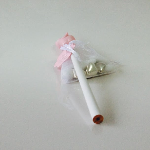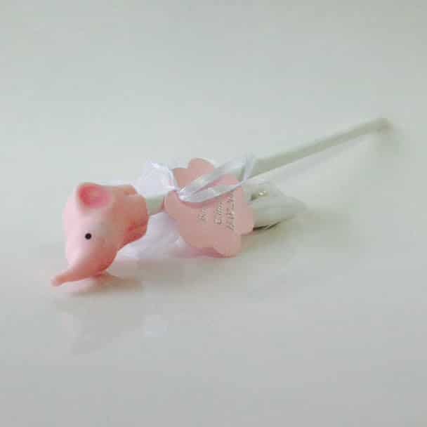 Ce joli crayon de papier avec un petit éléphant au bout, sera le cadeau idéal que vous offrirez aux enfants pour le baptême de votre enfant.Vous pouvez agrémenter ce crayon avec un sac organza non compris dans le prix, afin d’y insérer vos dragées, prévoir 25 à 30 gr par sac soit environ 8 à 10 dragées.