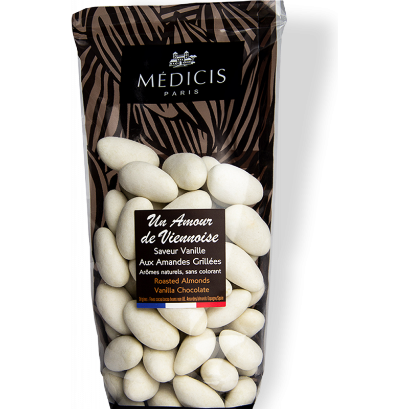 Dragées Médicis Viennoise. Spécialité croustillante et gourmande aux amandes grillées, enrobées chocolat. Parfum naturel de vanille. Finition blanc nature sans colorant.