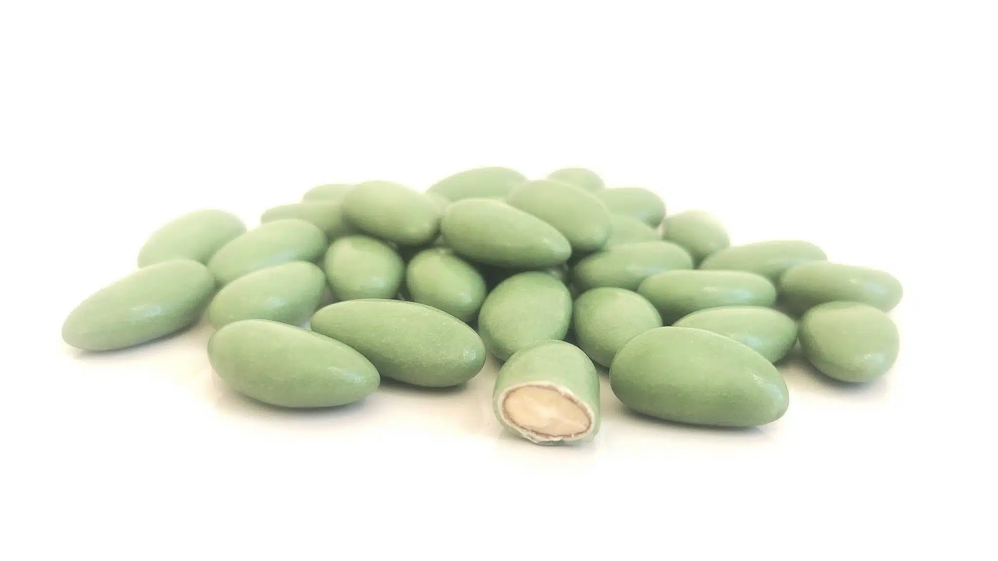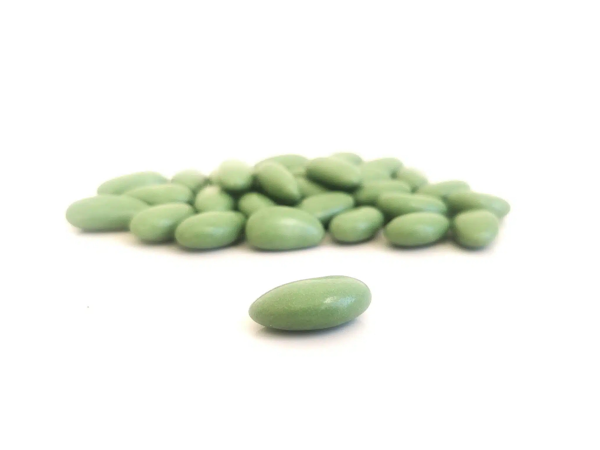 Dragées amandes vert eucalyptus de fabrication française, 43% d’amande (amande longuette d’Espagne). Dragées amandes brillantes existent en différent coloris : vert anis, blanc, noir, gris, taupe, fuchsia, rose, turquoise, violet, lilas, marron, ivoire, rouge, jaune, orange, bleu ciel.
