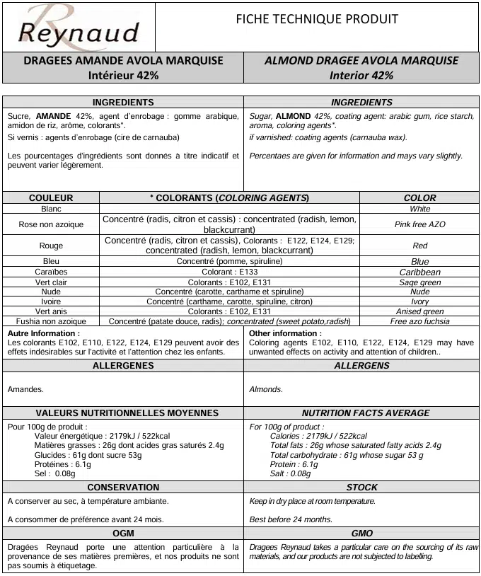 • Ingrédients : sucre, AMANDE 42 %, agent d’enrobage : gomme arabique, amidon de riz, arôme
