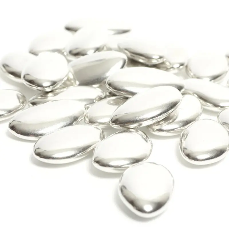 Dragées Argentées au chocolat : cette dragée au chocolat de couleur Argent métallisé, au cœur tendre pur beurre de cacao, enrobée d’une couche de sucre ravira tous vos convives par sa belle couleur métalisée.