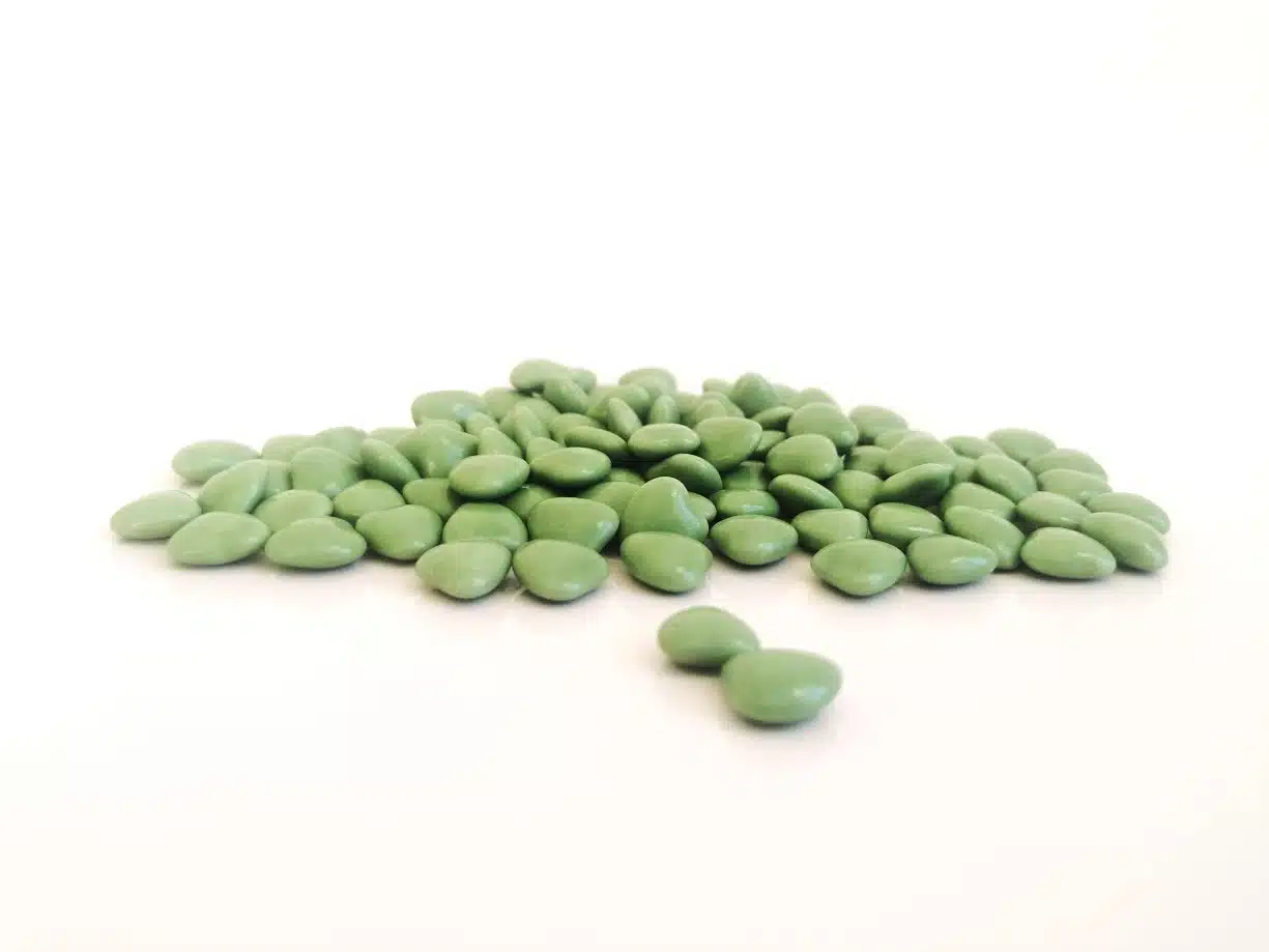 Dragées coeur vert eucalyptus au chocolat de fabrication française. Sans amande, idéal pour les enfants ! Les dragées coeur vert eucalyptus sont au chocolat noir 71% de cacao moulé et enrobé d’une très fine couche de sucre. Ces dragées mini coeur au chocolat sont vendus par boite de 500 grammes, soit environ 500 dragées coeur.