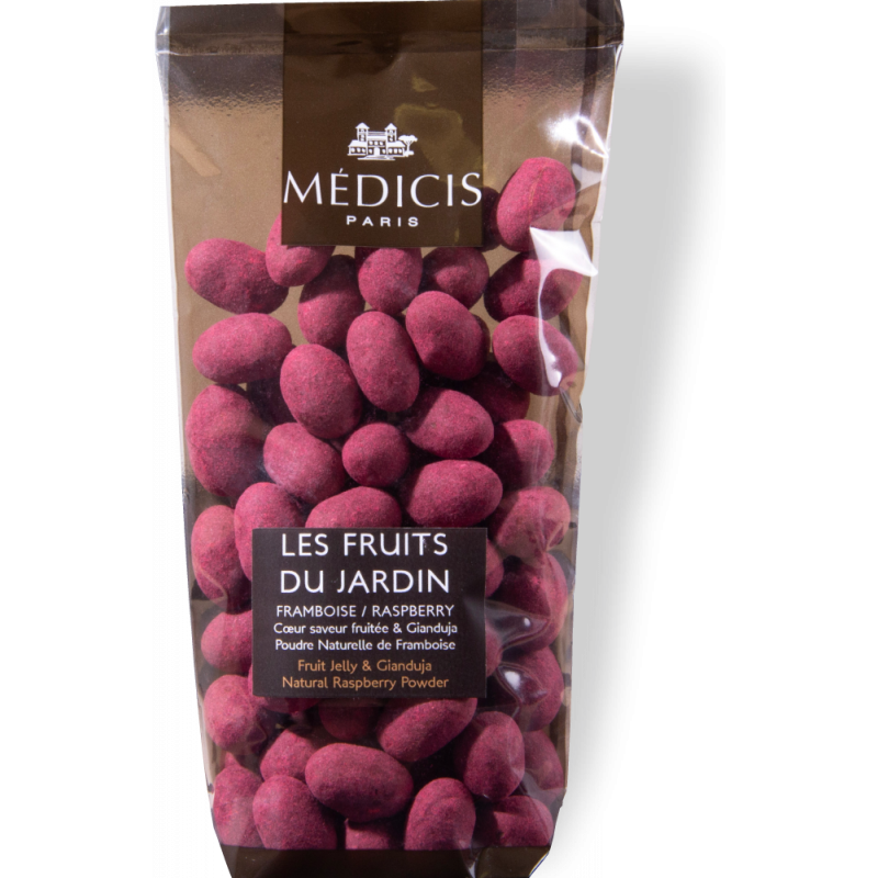 Ingrédients : Sucre, pâte de cacao, beurre de cacao, LAIT entier en poudre, pâte de NOISETTES, sirop de glucose, poudre de framboise lyophilisée 3%, émulsifiant : lécithine de SOJA, pectine, acidifiant : acide citrique, gomme arabique, amidon de riz et de pomme de terre, arôme naturel de framboise, arôme.