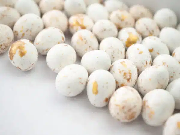 Quelle délicieuse nouveauté dans un ton intemporel ! Ces jolis dragées en forme de goutte sont fourrés de chocolat au lait.
