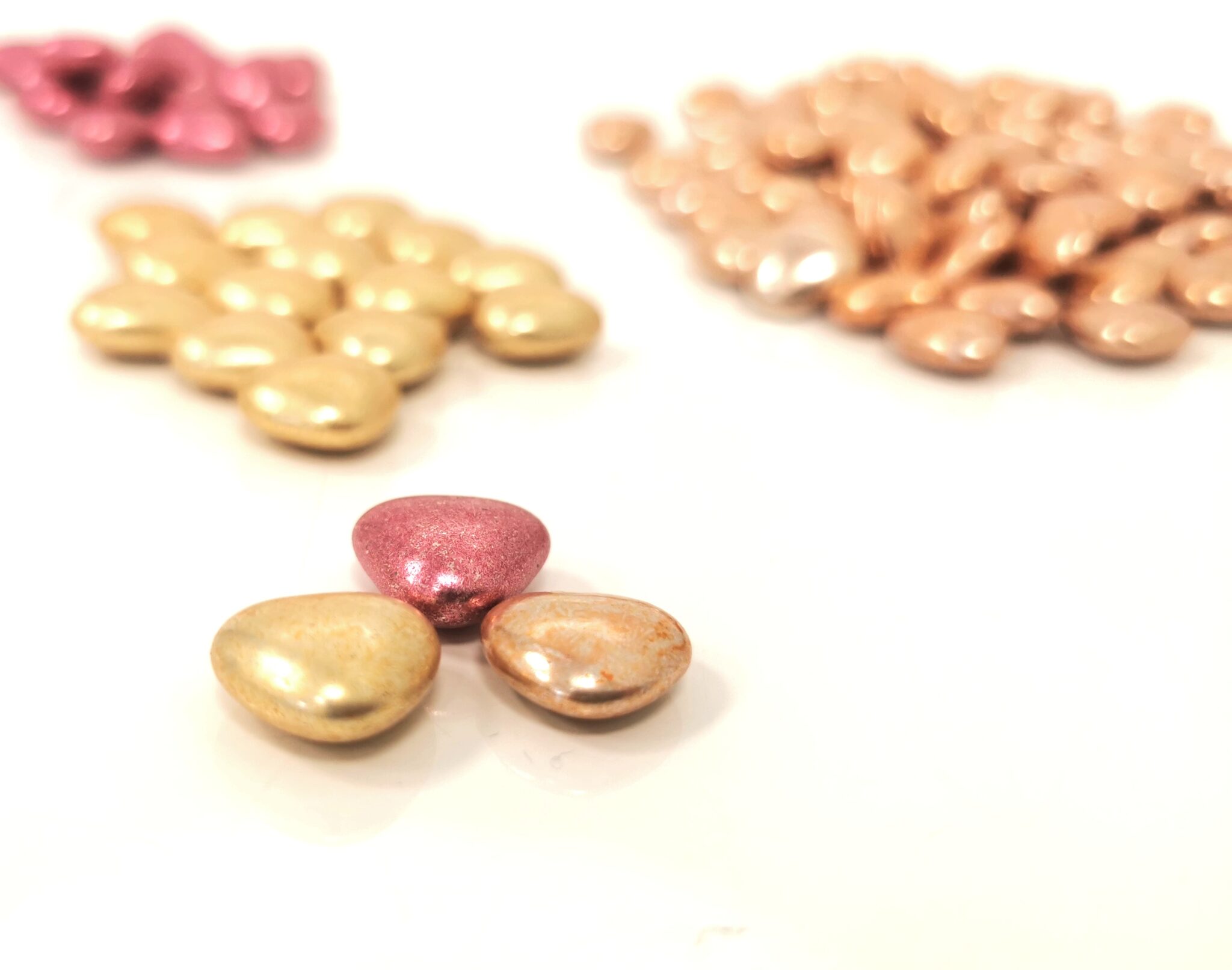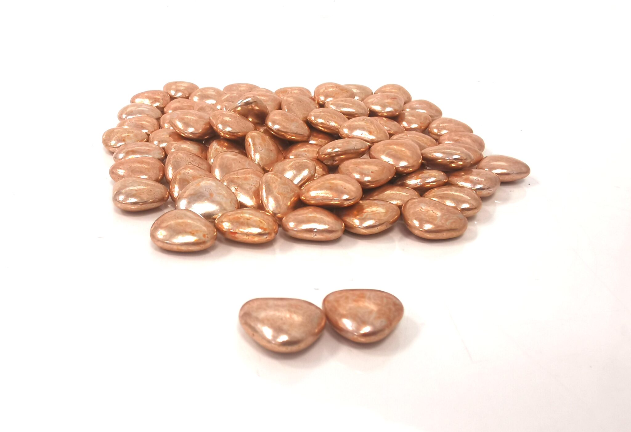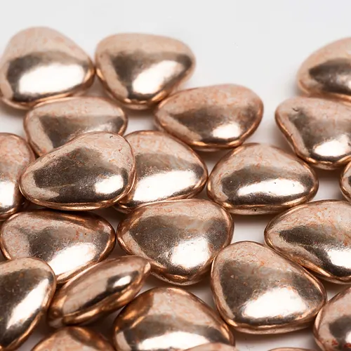 Dragées cuivrées en forme de petits coeurs , teneur en cacao 70% minimum.