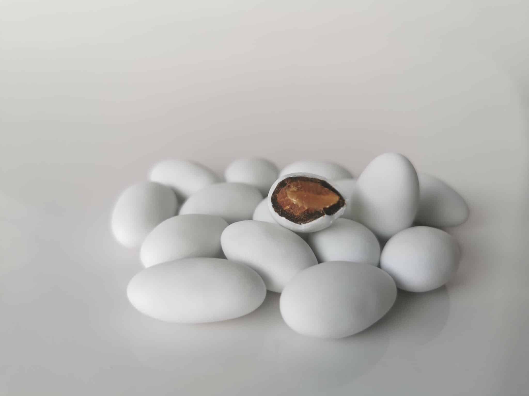 Dragées galet Amande enrobée de chocolat noir sous une fine couche de sucre en coloris blanc brillant (existe aussi en coloris rose et bleu). Découvrez un large choix de dragées originales ici.
