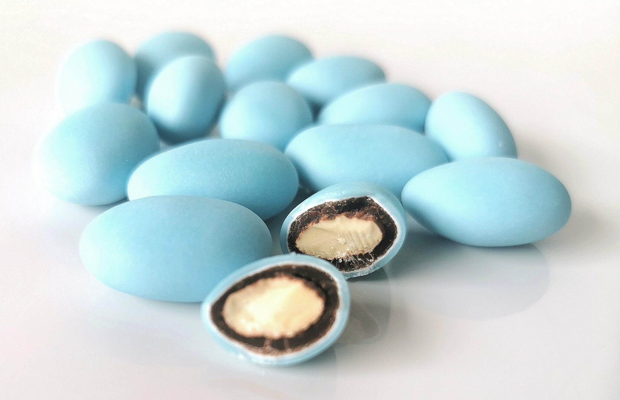 Dragées galet Amande enrobée de chocolat noir sous une fine couche de sucre en coloris bleu brillant (existe aussi en coloris rose et bleu). Découvrez un large choix de dragées originales ici.