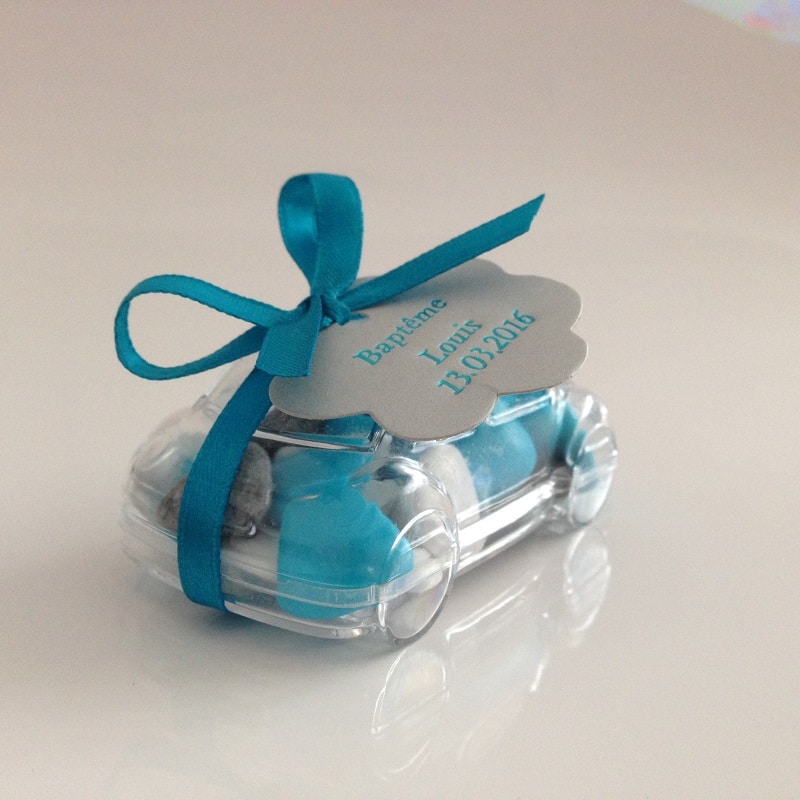 Contenant dragées voiture en plexi. Ce contenant à dragées en forme de voiture en plexi sera le cadeau idéal que vous offrirez pour le baptême ou l’anniversaire de votre petit garçon.