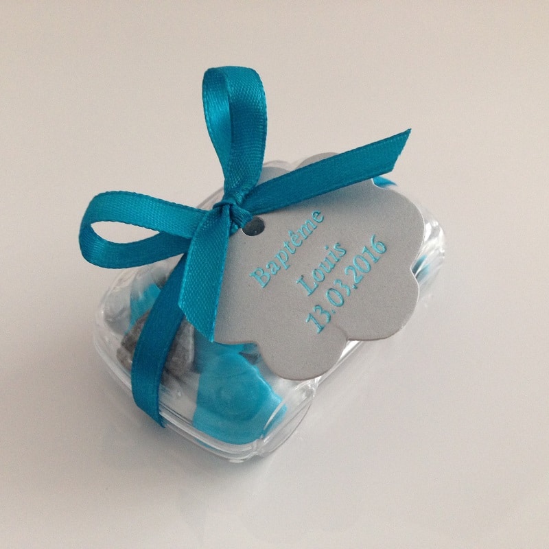Prévoir 40 cm de ruban par voiture. Ajouter une étiquette à dragées que vous pouvez personnaliser à l’aide du forfait impression ici.