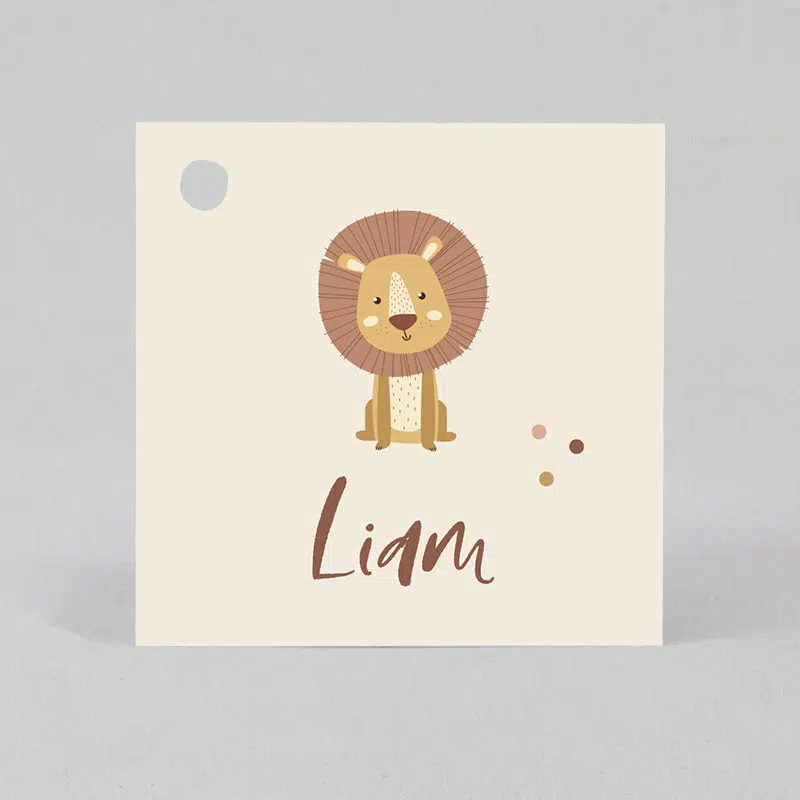 Étiquettes à dragées carré Lion, idéal pour personnaliser vos boites à dragées. Elles sont pourvues d’une perforation sur le coté gauche afin d’y passer un ruban satin, illustré d’un joli Lion.