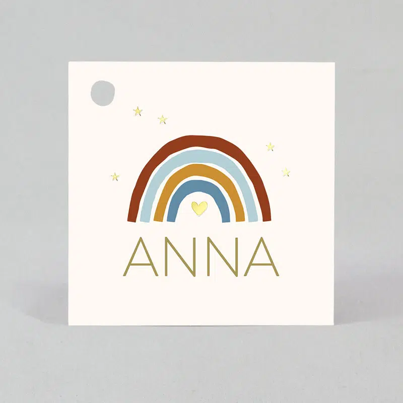Étiquettes à dragées carré Nude Arc en Ciel, idéal pour personnaliser vos boites à dragées. Elles sont pourvues d’une perforation sur le coté gauche afin d’y passer un ruban satin, illustré d’un joli arc en ciel et jolies motif en dorrure à chaud (étoiles et coeur).
