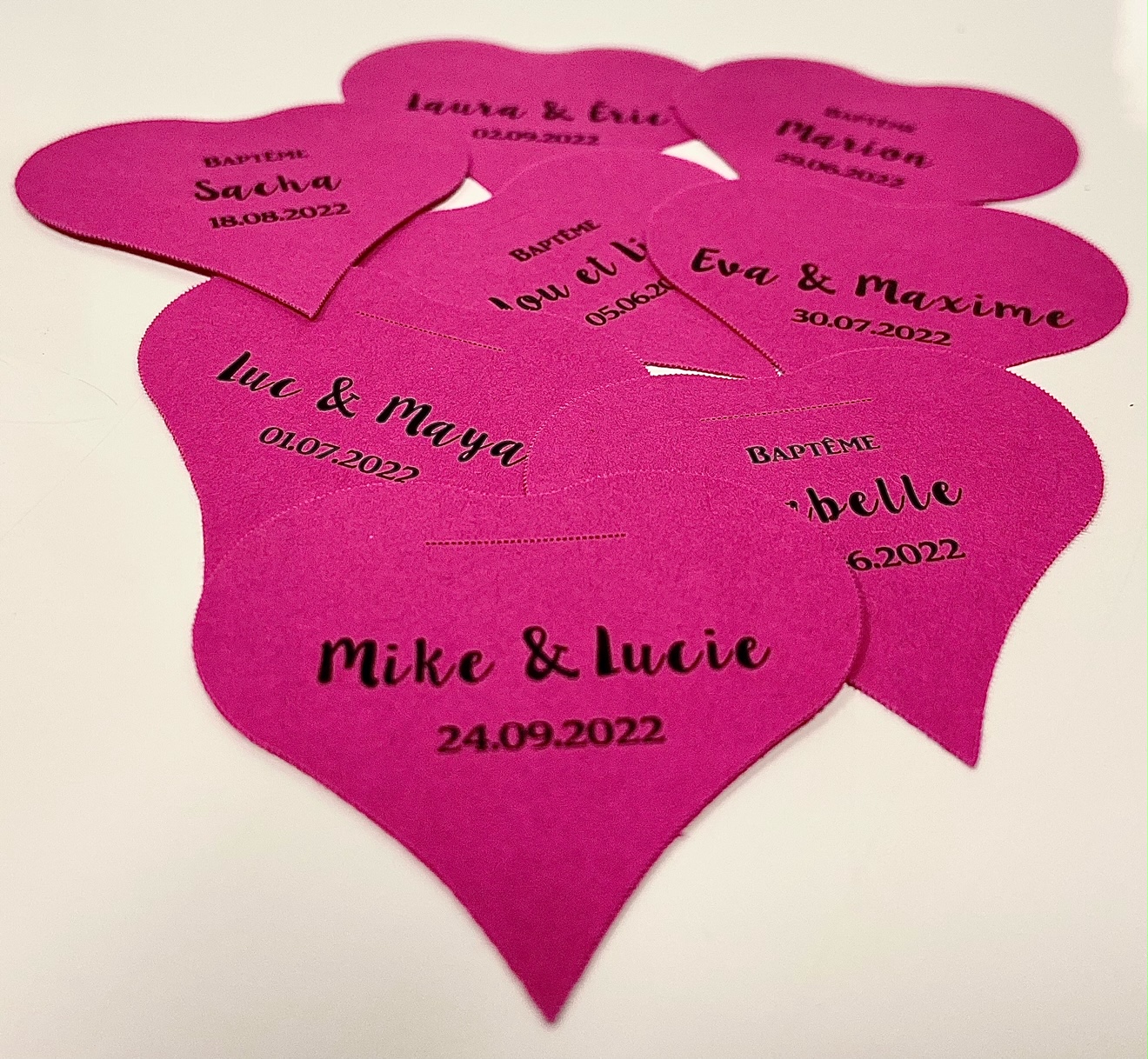 Etiquette fuchsia en forme de coeur. Cette jolie étiquette personnalisée, dispose d’une fente pour y passer un ruban, afin de pouvoir la fixer à votre contenant à dragées.